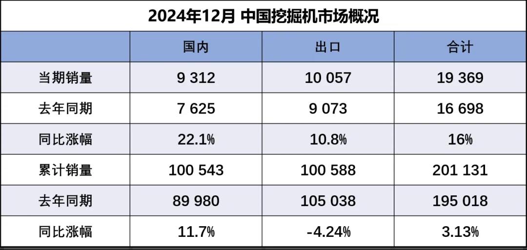 2025-01據(jù)中國工程機械工業(yè)協(xié)會對挖掘機主要制造企業(yè)統(tǒng)計,2024年12月銷售各類挖掘機19369臺,同比增長16%。其中國內(nèi)銷量9312臺,同比增長22.1%;出口量10057臺,同比增長10.8%。2024年,共銷售挖掘機201131臺,同比增長3.13%;其中國內(nèi)銷量10054…......